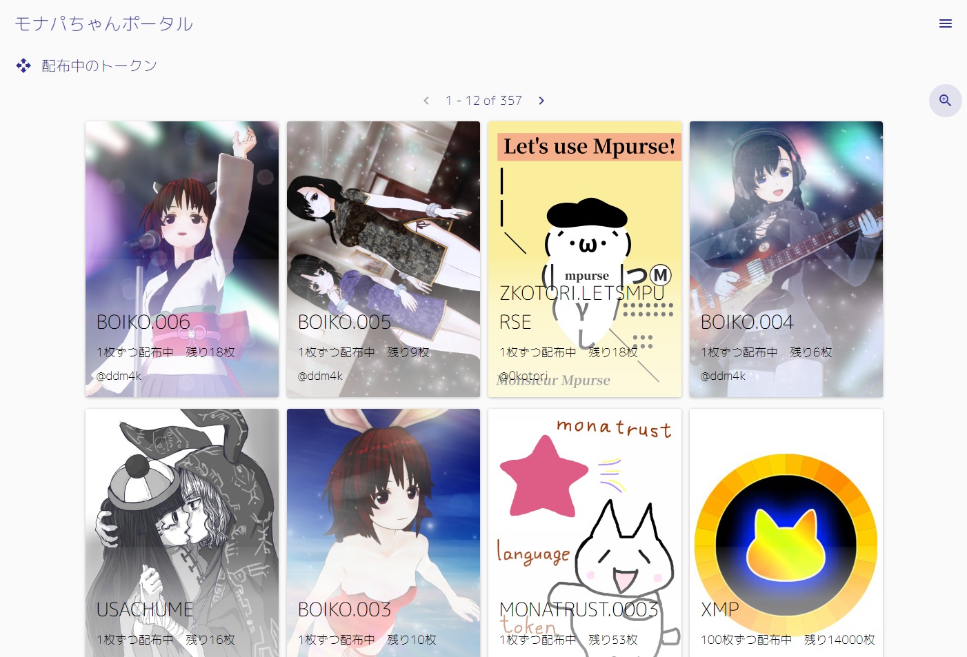 モナパちゃんポータルの保有トークンページに戻るとおねだりしたカードを受信しています。ツイートした瞬間に入る訳ではないので数分は待ちましょう。この繰り返しでどんどん欲しいカードを貰っていきます。