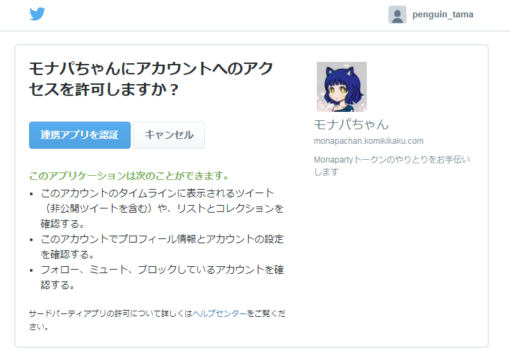 モナパちゃんポータルとTwitterを連携させるかの確認画面が表示されます。”連携アプリを認証”を押して連携させます。これでモナカードを貰う準備が整いました。